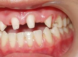 2、重症。釉质实质性缺损,牙齿表面有带状或窝状的凹陷,变色呈白垩色或黄褐色,严重者无釉质形成或牙冠形态改变或缩小。